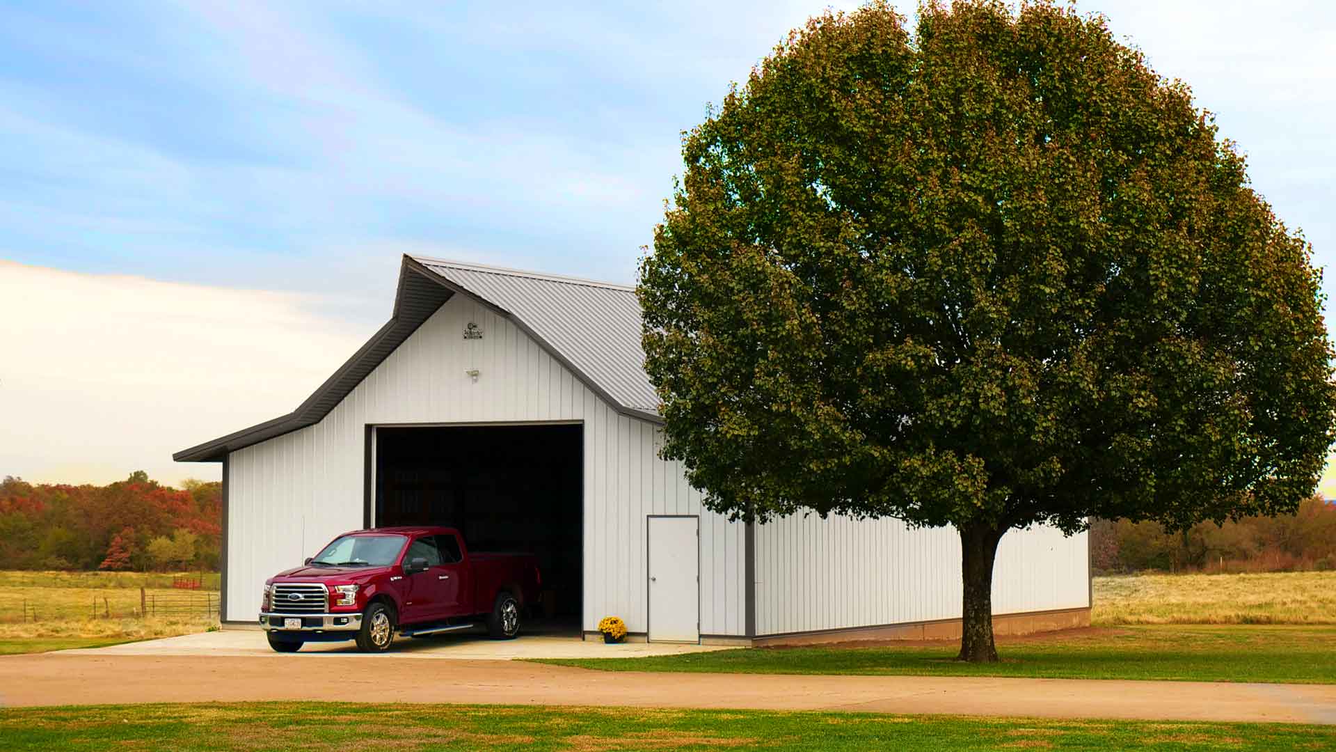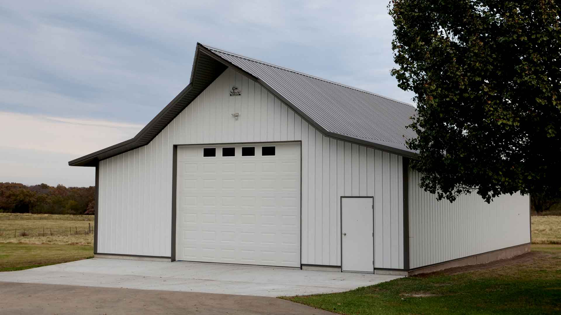 Traditional white hobby garage built in Buffalo, Missouri.
