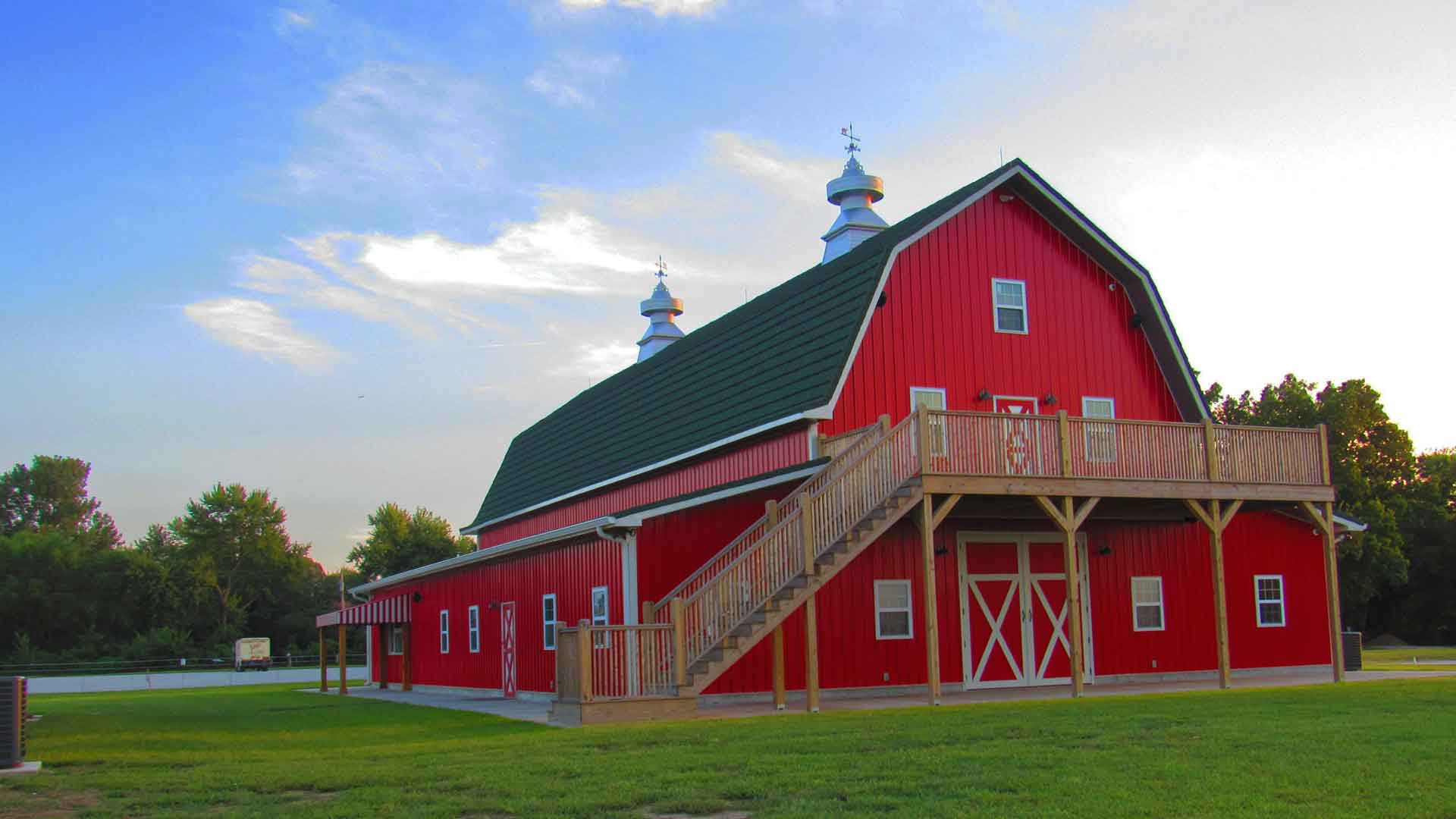 Traditional red barn venue with lean-tos on both sides.